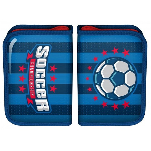 Piórnik jednokomorowy z dwoma klapkami z wyposażeniem (długopis, ołówek, 7 pisaków, 9 kredek, gumka, linijka, temperówka, ekierka). Zadrukowane kolorowe wnętrze.