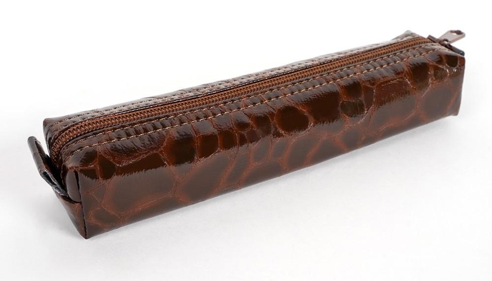 Małe skórzane etui z zamkiem błyskawicznym, błyszcząca zmywalna powierzchnia, wymiary piórnika 20 x 4,5 x 3,5 cm (w x h x d), bez wyposażenia.