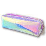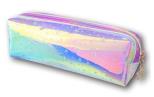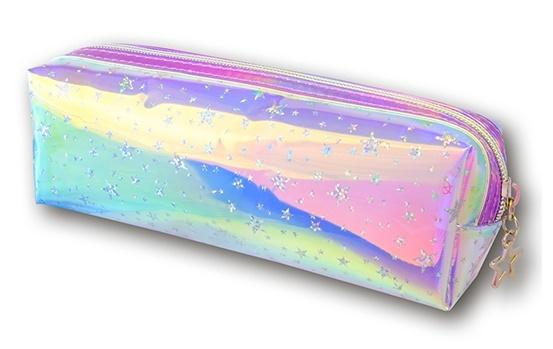 Piórnik wykonany jest z holograficznego materiału w gwiazdki błyszczy się i mieni wieloma kolorami. Holograficzny materiał jest półprzezroczysty, dzięki temu łatwiej odnaleźć potrzebne akcesoria. Piórnik posiada jedną komorę zamykaną na suwak zakończony metaliczną gwiazdką.
