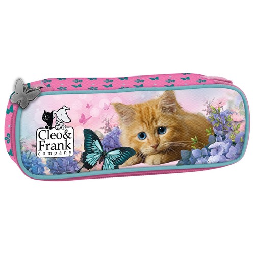 Piórnik saszetka jednokomorowy, ozdobiony motywami Cleo i Frank. Zamek błyskawiczny z ozdobnym uchwytem. Nie zawiera wyposażenia.