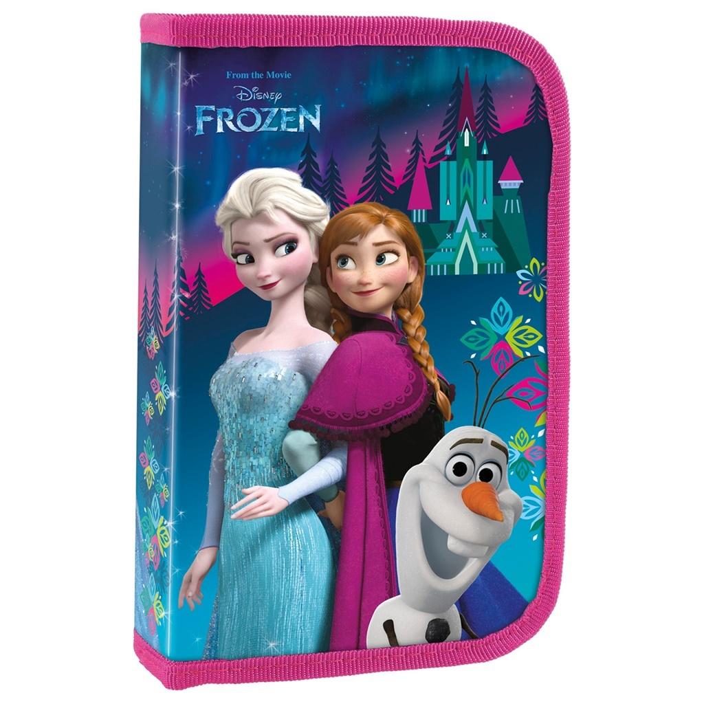 Piórnik jednokomorowy, dwuklapkowy ozdobiony motywami Kraina Lodu. Zamek błyskawiczny z ozdobnym uchwytem. Nie zawiera wyposażenia.