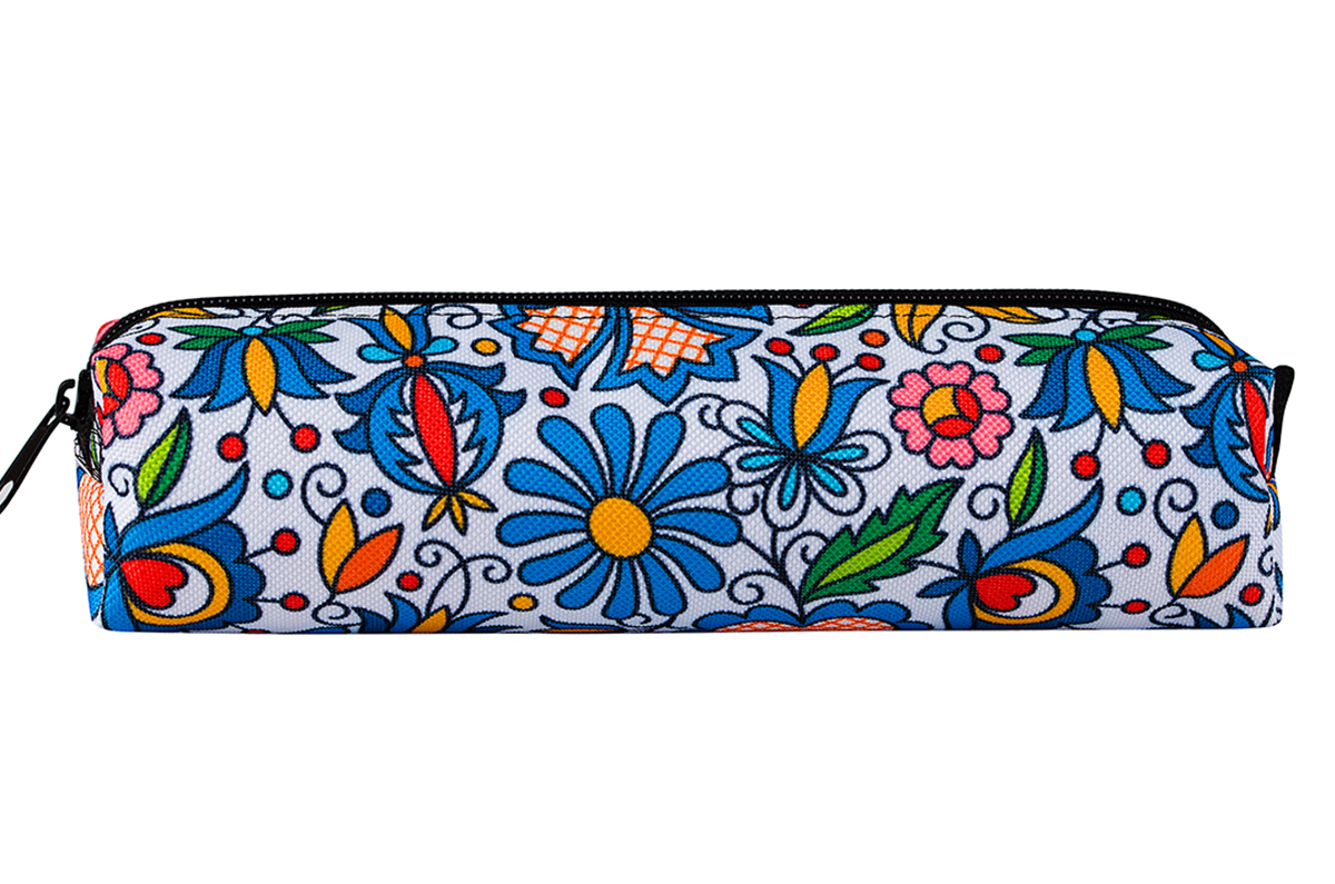 Piórnik z motywem kaszubskim : o kształcie prostopadłościanu,wykonany z poliestru,jednokomorowy, zapinany na zamek błyskawiczny,nie posiada dodatkowego usztywnienia,piórnik idealny do szkoły, biura, na uczelnię