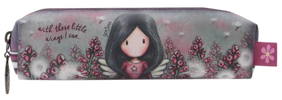 Piórnik - Gorjuss - Little Wings. Piórnik ozdobiony wizerunkiem dziewczynki Gorjuss ze skrzydełkami na seledynowo - różowym tle. Zmieszczą się w nim zarówno ołówki i długopisy, kosmetyki czy inne drobiazgi. Suwak ozdobiony medalionem w stylu antycznego mosiądzu. Wykonany ze szczególną dbałością. Wewnątrz posiada ciekawy wzór w stylowe paski. Wspaniały prezent, funkcjonalny dodatek do każdego tornistra, plecaka czy biurka.