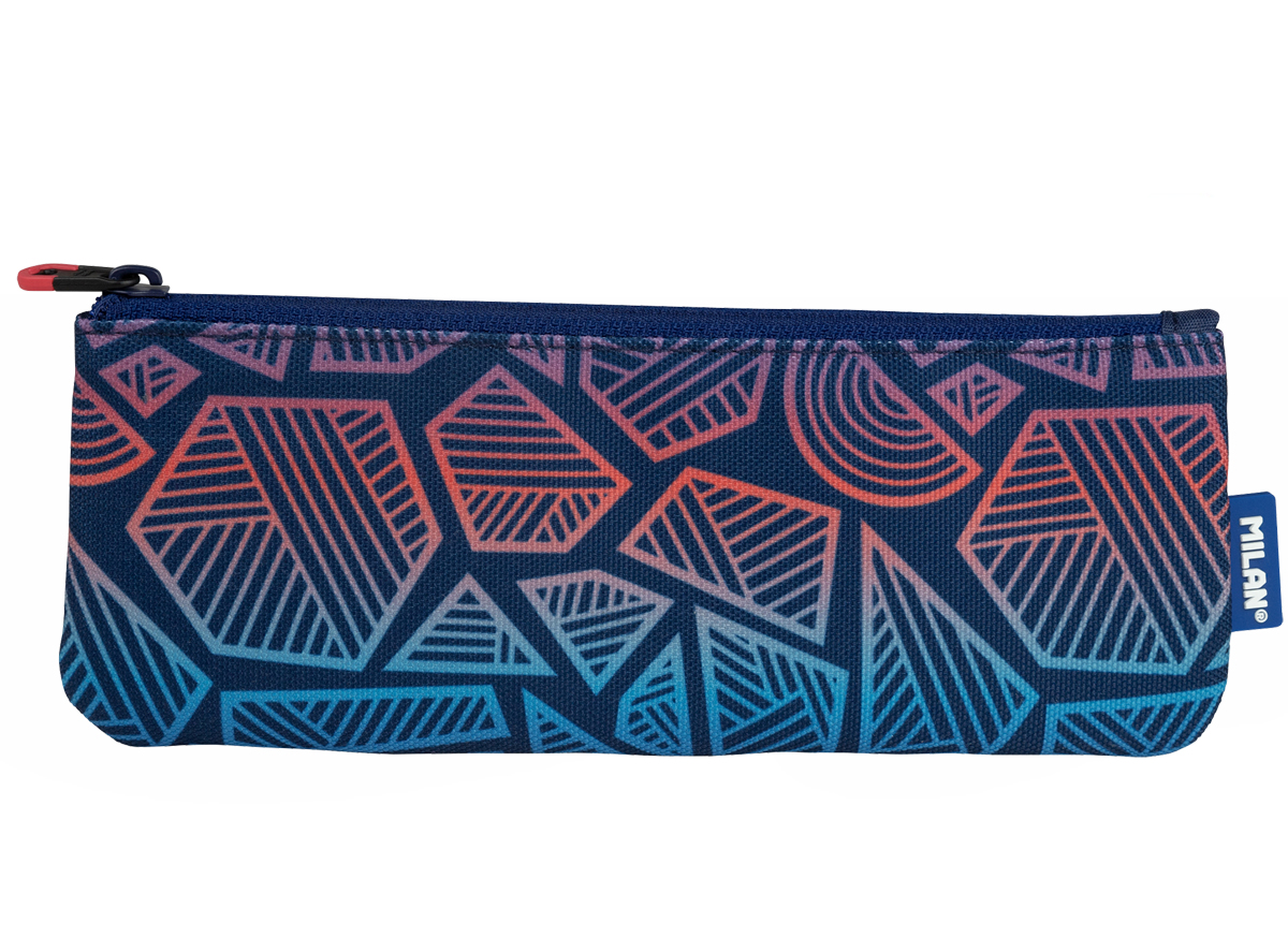 Piórnik MILAN mini płaski z kolekcji FIT w kolorze niebieskim z czerwonym i niebieskim nadrukiem.
