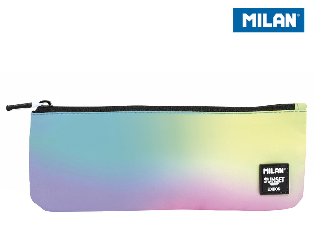 Piórnik MILAN mini płaski z kolekcji SUNSET zapinany na suwak w kolorach tęczy. Materiał: podszewka zewnętrzna i wewnętrzna z poliestru. Rozmiar: 23 x 9 x 1,5 cm.