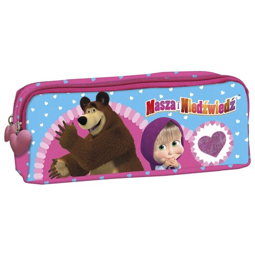 Piórnik bez wyposażenia ozdobiony postaciami z bajki Masza i Niedźwiedź. Posiada dwie pojemne komory zapinane na zamki błyskawiczne. Suwaki zakończone są ozdobnymi uchwytami.