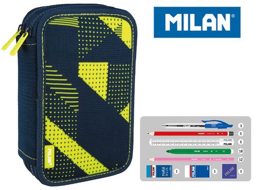 Piórnik MILAN 2-poziomowy z wyposażeniem z kolekcji KNIT w kolorze czarno - żółtym. Wyposażenie: długopis P1 niebieski, ołówek sześciokątny HB, linijka trójkątna 15 cm, 18 flamastrów, 12 kredek trójkątnych, temperówka, 2 gumki do ścierania. Przy produkcji piórników użyto najlepszych materiałów, bardzo wytrzymałych suwaków oraz wzmocnionych nici. Niepowtarzalne wzornictwo. W piórnikach MILAN znajdziesz min.: • Kredki MILAN przy produkcji których użyto drewna pochodzącego wyłącznie z plantacji, gwarantujących nie używanie drewna z lasów deszczowych Rysik kredki na całej długości jest przyklejony do drewna co zapobiega jego łamaniu. Dzięki trójkątnej budowie kredka jest ergonomiczna i wygodnie trzyma się dziecku. • Flamastry MILAN posiadają wytrzymałą i elastyczną stożkową końcówką, która nie wpada do środka nawet przy silnym nacisku. Po chwilowym odkształceniu końcówka zawsze wraca do pierwotnego kształtu. Tusz na bazie wody. Flamastry nie zawierają ftalanów, metali ciężkich i innych • Temperówkę z bezpiecznym przykręconym ostrzem dzięki czemu ostrze nie oddzieli się od obudowy temperówki • Gumkę z naturalnym kauczukiem. Wymiary: 19,5 x 13 x 5 cm. Materiał wierzchni: 100% poliester. Podszewka 150D poliester.