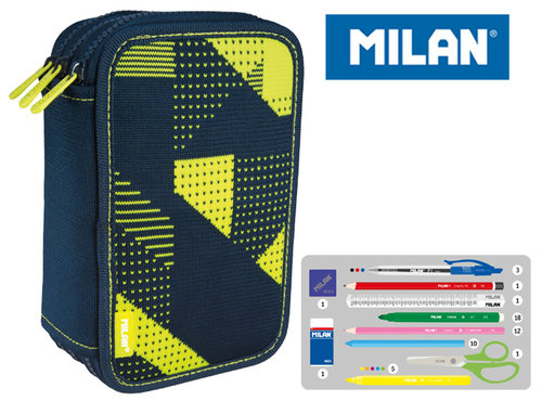 Piórnik MILAN 3-poziomowy z wyposażeniem z kolekcji KNIT w kolorze czarno - żółtym. Wyposażenie: 3 długopisy P1, ołówek sześciokątny HB, linijka trójkątna 15 cm, 18 flamastrów, 12 kredek trójkątnych, 10 kredek PLASTIPASTEL, 5 zakreślaczy cienkich, nożyczki, temperówka, gumka do ścierania. Przy produkcji piórników użyto najlepszych materiałów, bardzo wytrzymałych suwaków oraz wzmocnionych nici. Niepowtarzalne wzornictwo. W piórnikach MILAN znajdziesz min.: • Kredki MILAN przy produkcji których użyto drewna pochodzącego wyłącznie z plantacji, gwarantujących nie używanie drewna z lasów deszczowych Rysik kredki na całej długości jest przyklejony do drewna co zapobiega jego łamaniu. Dzięki trójkątnej budowie kredka jest ergonomiczna i wygodnie trzyma się dziecku. • Flamastry MILAN posiadają wytrzymałą i elastyczną stożkową końcówką, która nie wpada do środka nawet przy silnym nacisku. Po chwilowym odkształceniu końcówka zawsze wraca do pierwotnego kształtu. Tusz na bazie wody. Flamastry nie zawierają ftalanów, metali ciężkich i innych • Temperówkę z bezpiecznym przykręconym ostrzem dzięki czemu ostrze nie oddzieli się od obudowy temperówki • Gumkę z naturalnym kauczukiem. Wymiary: 19,5 x 13 x 7,5 cm. Materiał wierzchni: 100% poliester. Podszewka 150D poliester.
