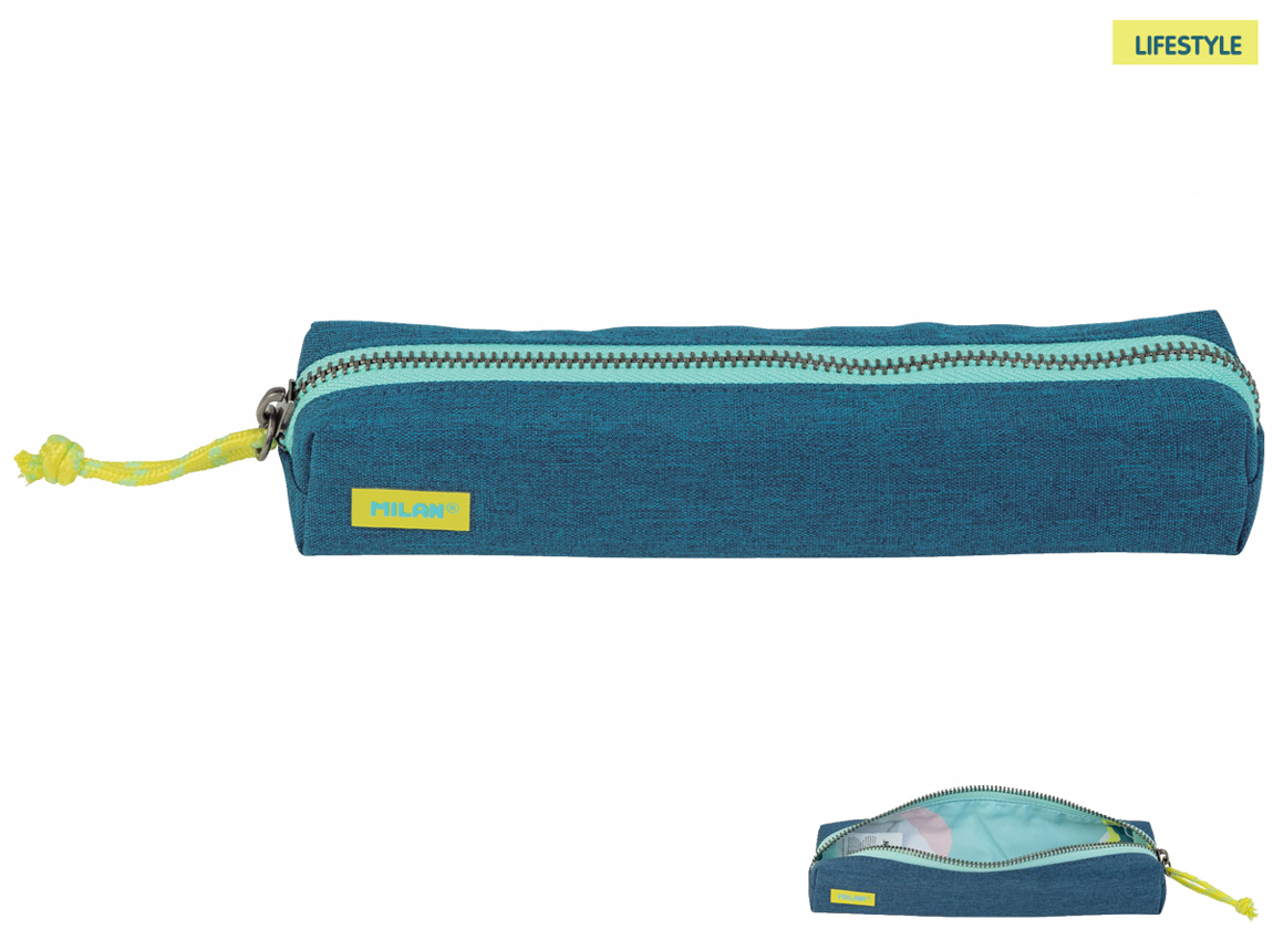 Piórnik MILAN mini kwadratowy z kolekcji LIFESTYLE zapinany na suwak w kolorze niebieskim z zielonymi i żółtymi detalami.