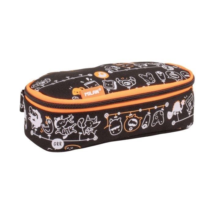 Piórnik owalny MILAN zapinany na suwak z kolekcji TANDEM. W środku dodatkowa kieszonka z siatki. Białe i fluo pomarańczowe nadruki na czarnym materiale przedstawiają różnorodne postacie przemierzące noc w tandemie. Dinozaury, krokodyle i kosmici, a także zabawne tosty, jajka i rogaliki. Wszystkie ze sobą współpracują i pędzą w tym samym kierunku. Skład: Materiał zewnętrzny i wewnętrzny 100% poliester. Wymiary: 20,5 x 9 x 5,5 cm.