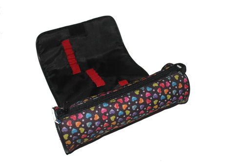 Piórnik tuba z klapką, na której wszyte zostały gumki na przybory. Wykonany z kodury.
