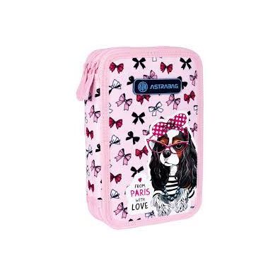Określenie francuski piesek nabrało właśnie nowego znaczenia. Podwójny piórnik Astrabag z uroczym motywem graficznym przedstawiającym modną paryską spanielkę skradnie serce każdej dziewczynki kochającej pieski i róż. Piórnik Astrabag nie posiada wyposażenia. Jednak dzięki dwóm pojemnym komorom pomieści niezbędne przybory, w tym kredki, flamastry, ołówki, długopisy i linijki.