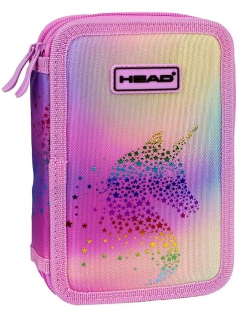 Podwójny piórnik Head z bajkowym, cekinowym jednorożcem to absolutny hit tego sezonu. Nadruk imitujący cekiny w połączeniu z pastelowym ombre pokocha każda dziewczynka. Piórnik Head nie posiada wyposażenia. Jednak dzięki dwóm pojemnym komorom pomieści niezbędne przybory, w tym kredki, flamastry, ołówki, długopisy i linijki.