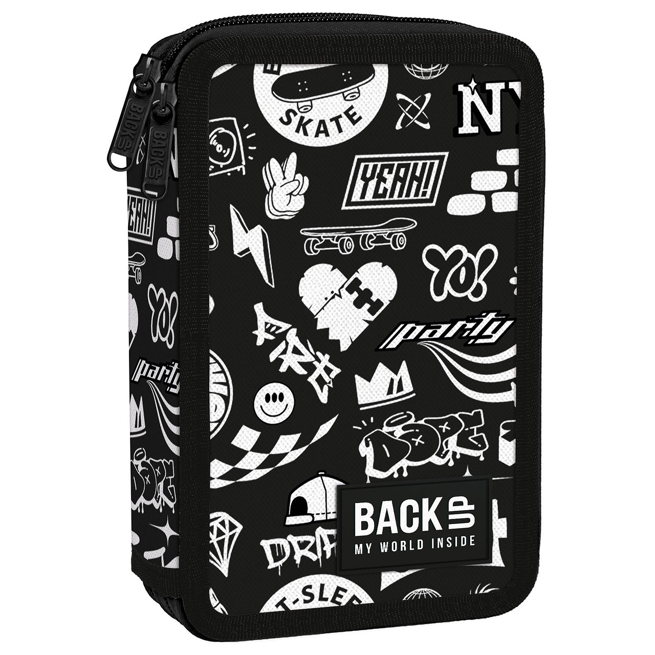 Zaprojektowany w nowoczesnym, miejskim charakterze. Z pewnością spodoba się młodym osobom ceniącym streetwearową estetykę. Mocny kontrast między tłem a grafikami sprawia, że wzór jest wyrazisty i przyciągający wzrok, jednocześnie pozostając uniwersalnym. Dwukomorowy piórnik BackUP z wyposażeniem posiada: - 18 pisaków - 9 kredek ołówkowych - 1 długopis - 1 ołówek - temperówkę, gumkę do mazania i linijkę - szlufki, które zapewniają bezpieczne i wygodne przechowywanie - dwie odrębne komory zamykane na zamek błyskawiczny - porządną, solidną i usztywnianą konstrukcję - rozmiar: 20x13x5 cm - waga: 350g. Nazwa kolekcji: Drift.