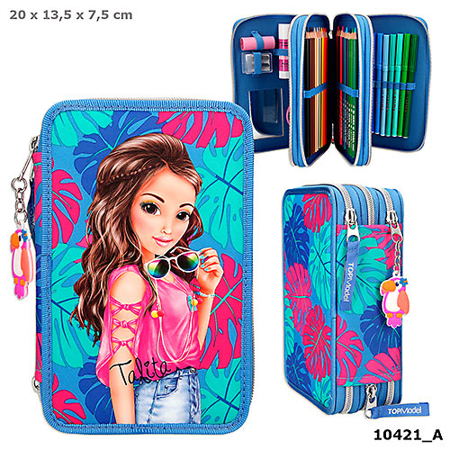 Potrójny piórnik zapinany jest na suwak, do suwaków dopięte są zawieszki. Jedna zakończona z zabawną zawieszką papugi. Piórnik wykonany z wysokiej jakości materiałów. Zachwyca swoim wyglądem. Utrzymany w niebieskiej tonacji z srebrnymi zamkami, przedstawia modelkę Talitę wśród tropikalnych liści.