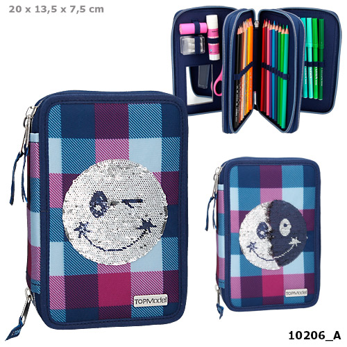 Piórnik potrójny Smiley TOP Model ze zmiennymi cekinami, z wyposażeniem.