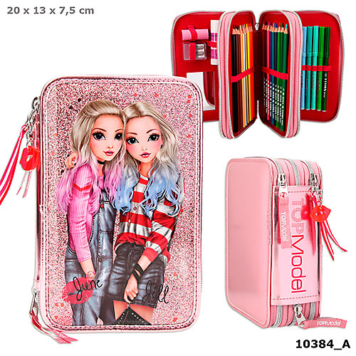 Piórnik Top Model Pink potrójny z wyposażeniem.Brokatowy wierzch z wizerunkiem June i Jill.