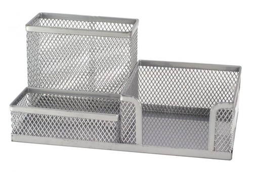 Piórnik wielofunkcyjny wykonany z metalowej siateczki z eleganckimi wykończeniami w tym samym kolorze, z trzema przegródkami różnego zastosowania: na karteczki, na przybory piśmienne oraz drobne akcesoria biurowe.