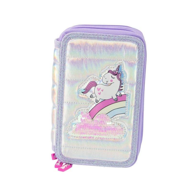 Piórnik posiada trzy przedziały, z zamkami błyskawicznymi, pokrytymi miękką, opalizującą, wodoodporną tkaniną ozdobioną jednorożcem z odwracalnymi cekinami.
