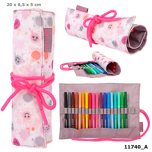 Piórnik rolka z flamastrami TOPModel HAPPY TOGETHER. W środku 20 gumeczek przytrzymuje 18 flamastrów, dodatkowe 2 gumki na ołówki lub długopisy. Rolka zawiązywana na sznurek.