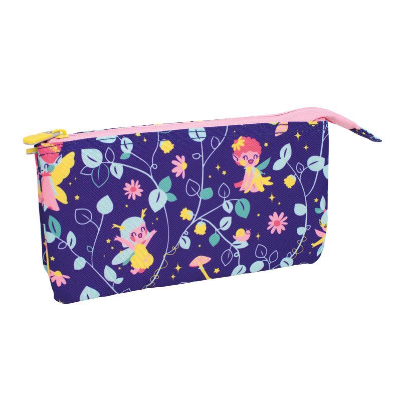 Piórnik saszetka z 5 komorami, zapinany na 2 suwaki. Kolekcja FAIRY TALE przedstawia las winorośli zamieszkany przez magiczne wróżki. Nadruk w tonacji turkusowej, żółtej i różowej na ciemnofioletowym tle.