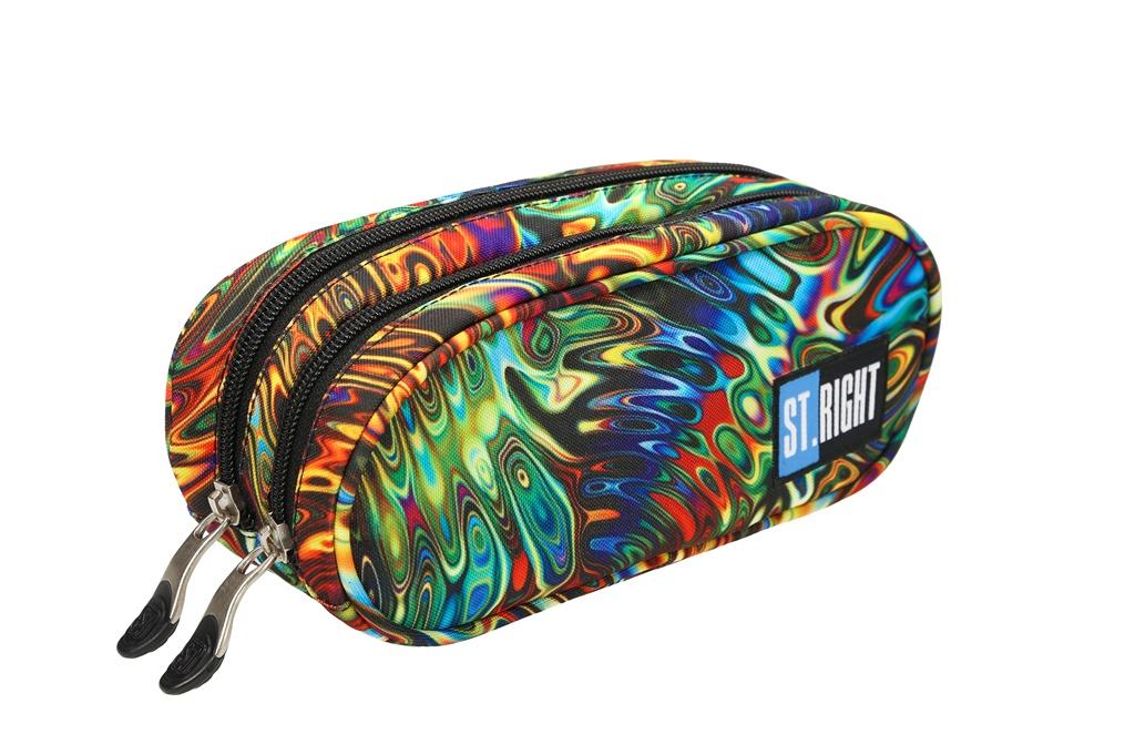 Pojemny i funkcjonalny piórnik dwukomorowy. Charakteryzuje się bardzo starannym wykonaniem oraz pięknym abstrakcyjnym wzorem. Piórnik uszyto z wytrzymałego i wodoodpornego materiału. Dwie oddzielne komory pomieszczą wszystkie potrzebne akcesoria. Komory zamykane są na suwaki, zakończone dużymi poręcznymi pullerami. Piórnik jest doskonałym uzupełnieniem do plecaka St.Right dostępnego w tej samej wersji kolorystycznej.