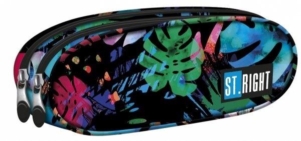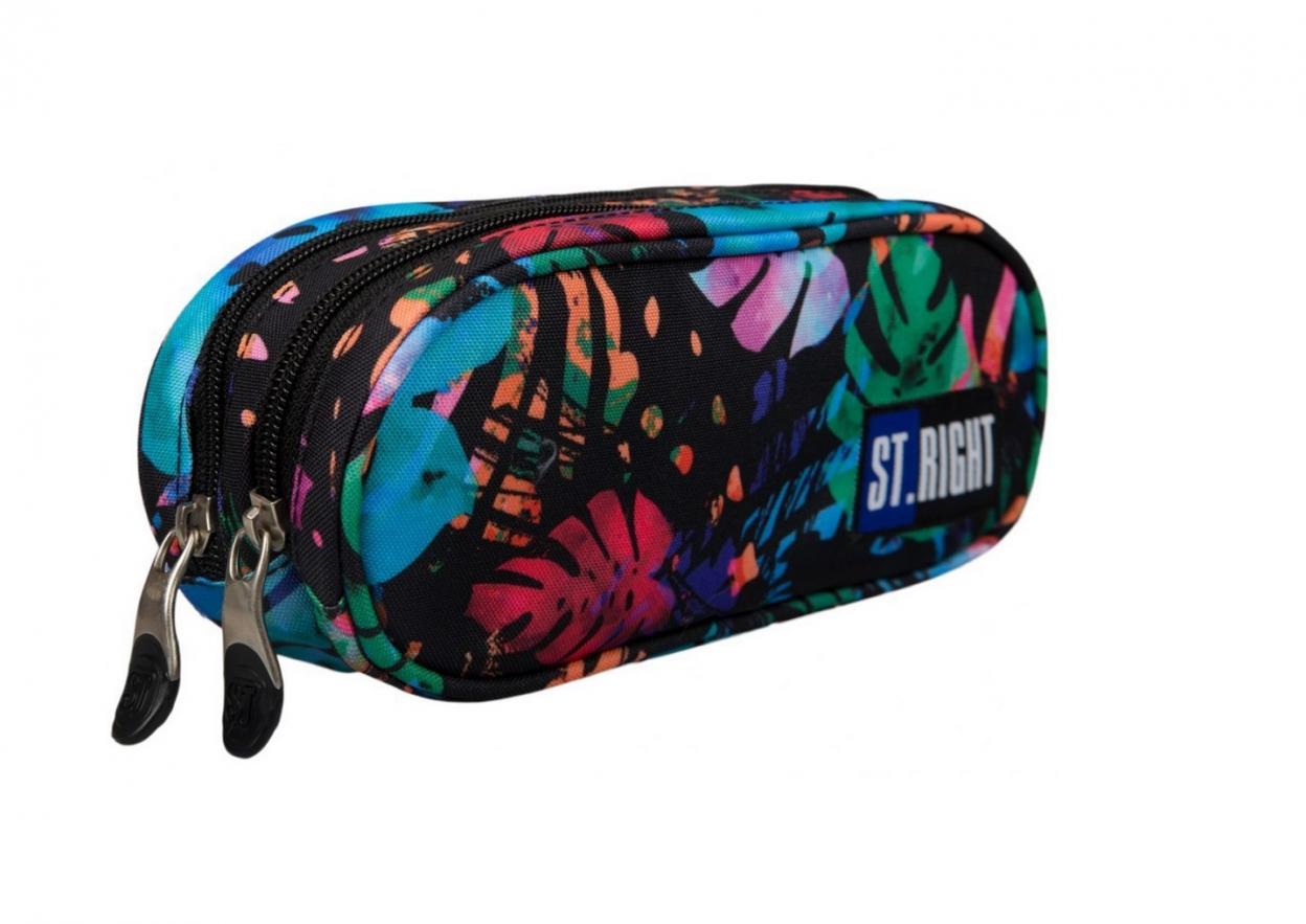 Pojemny i funkcjonalny piórnik dwukomorowy. Charakteryzuje się bardzo starannym wykonaniem oraz pięknym wzorem w kolorowe liście na ciemnym tle. Piórnik uszyto z wytrzymałego i wodoodpornego materiału. Dwie oddzielne komory pomieszczą wszystkie potrzebne akcesoria. Komory zamykane są na suwaki, zakończone dużymi poręcznymi pullerami. Piórnik jest doskonałym uzupełnieniem do plecaka St.Right dostępnego w tej samej wersji kolorystycznej.