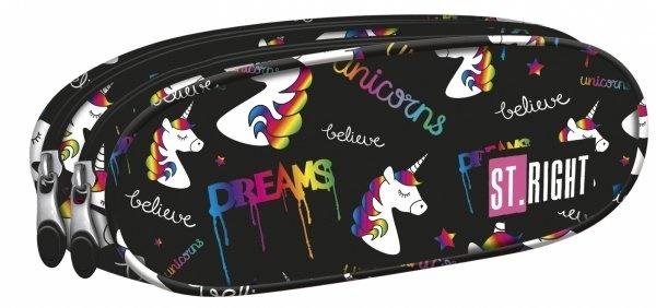 Pojemny i funkcjonalny piórnik dwukomorowy. Charakteryzuje się bardzo starannym wykonaniem oraz pięknym wzorem w jednorożce. Piórnik uszyto z wytrzymałego i wodoodpornego materiału. Dwie oddzielne komory pomieszczą wszystkie potrzebne akcesoria. Komory zamykane są na suwaki, zakończone dużymi poręcznymi pullerami. Piórnik jest doskonałym uzupełnieniem do plecaka St.Right dostępnego w tej samej wersji kolorystycznej.