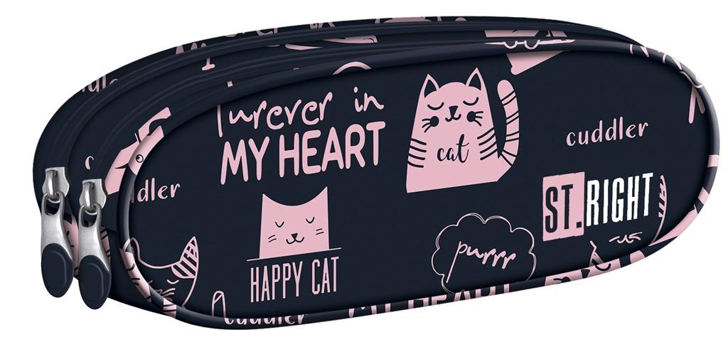 Pojemny i funkcjonalny piórnik dwukomorowy. Charakteryzuje się bardzo starannym wykonaniem oraz pięknym wzorem w różowe kotki na ciemnym tle. Piórnik uszyto z wytrzymałego i wodoodpornego materiału. Dwie oddzielne komory pomieszczą wszystkie potrzebne akcesoria. Komory zamykane są na suwaki, zakończone dużymi poręcznymi pullerami. Piórnik jest doskonałym uzupełnieniem do plecaka St.Right dostępnego w tej samej wersji kolorystycznej.