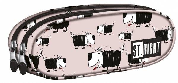 Pojemny i funkcjonalny piórnik dwukomorowy. Charakteryzuje się bardzo starannym wykonaniem oraz pięknym wzorem w zabawne pieski na pastelowym tle. Piórnik uszyto z wytrzymałego i wodoodpornego materiału. Dwie oddzielne komory pomieszczą wszystkie potrzebne akcesoria. Komory zamykane są na suwaki, zakończone dużymi poręcznymi pullerami. Piórnik jest doskonałym uzupełnieniem do plecaka St.Right dostępnego w tej samej wersji kolorystycznej.