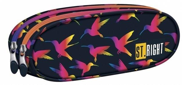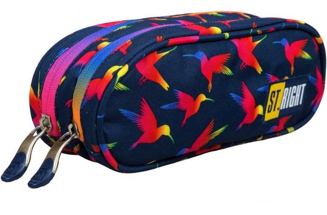 Pojemny i funkcjonalny piórnik dwukomorowy. Charakteryzuje się bardzo starannym wykonaniem oraz niezwykle oryginalnym wzorem w tęczowe kolibry na ciemnym tle. Piórnik uszyto z wytrzymałego i wodoodpornego materiału. Dwie oddzielne komory pomieszczą wszystkie potrzebne akcesoria. Komory zamykane są na suwaki, zakończone dużymi poręcznymi pullerami. Piórnik jest doskonałym uzupełnieniem do plecaka St.Right dostępnego w tej samej wersji kolorystycznej.