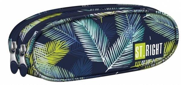 Pojemny i funkcjonalny piórnik dwukomorowy. Charakteryzuje się bardzo starannym wykonaniem oraz pięknym wzorem w tropikalne liście na ciemnym tle. Piórnik uszyto z wytrzymałego i wodoodpornego materiału. Dwie oddzielne komory pomieszczą wszystkie potrzebne akcesoria. Komory zamykane są na suwaki, zakończone dużymi poręcznymi pullerami. Piórnik jest doskonałym uzupełnieniem do plecaka St.Right dostępnego w tej samej wersji kolorystycznej.