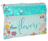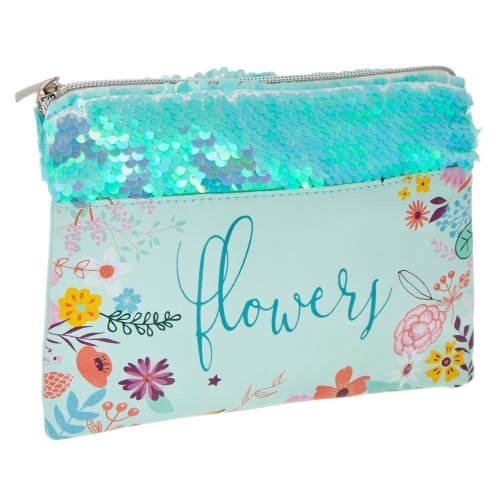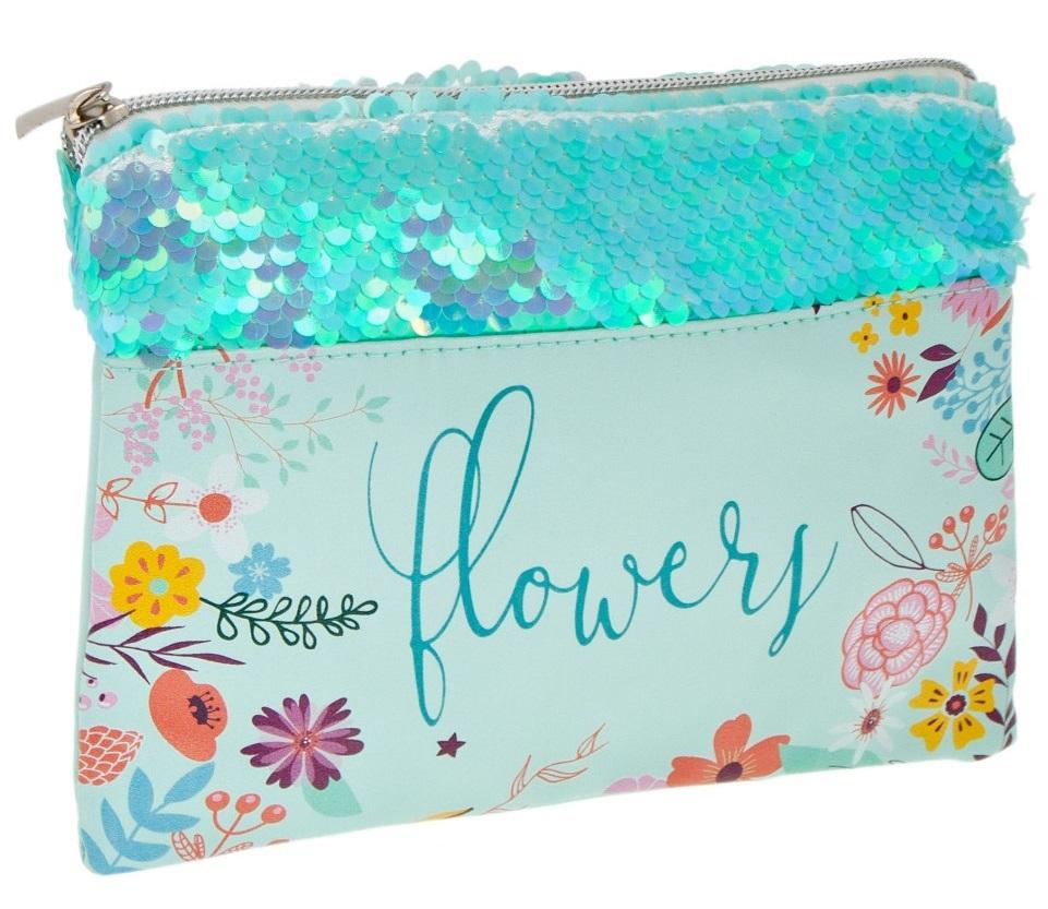 Piórnik w kształcie saszetki z zamkiem błyskawicznym. Pomieści niezbędne artykuły piśmiennicze i nie zajmie dużo miejsca w plecaku. Z kwiatowym nadrukiem i cekinami. Wymiary: 20 x 14 cm