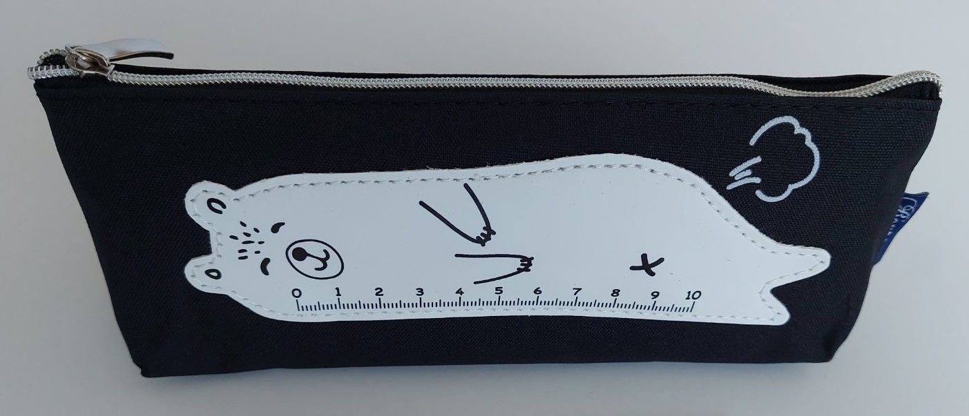 Piórnik z naszywką misia z linijką, zamykany na zamek. Doskonale nadaje się do szkoły.