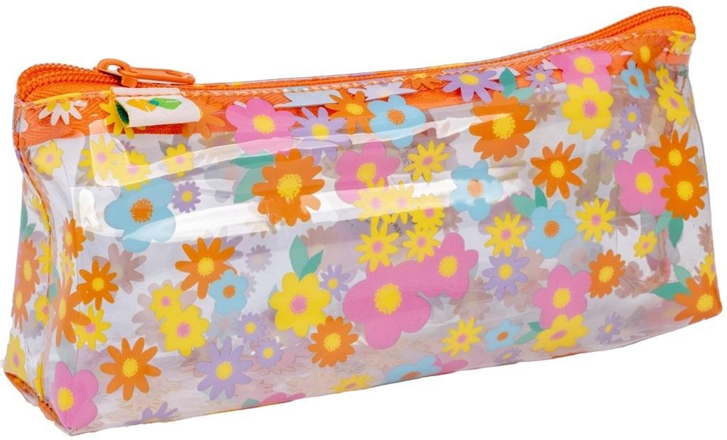 Transparentny piórnik - saszetka z motywem kwiatowym. Wykonany z wytrzymałego materiału odpornego na zabrudzenia. Wymiary: 21 x 10 x 5 cm.