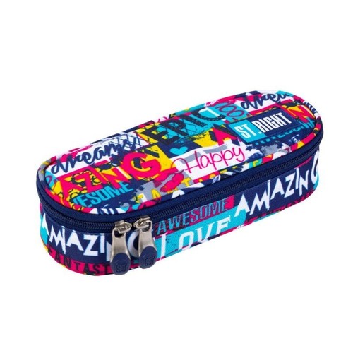 Funkcjonalność: 1 pojemna komora główna dodatkowa klapka z miejscem na przybory piśmiennicze oraz kieszonką zapinaną na suwak cały korpus piórnika usztywniony gąbką ergonomicznie wyprofilowany, solidny uchwyt do suwaka Wymiary: wysokość: 6 cm szerokość: 23 cm głębokość: 9,5 cm Waga: 160 g