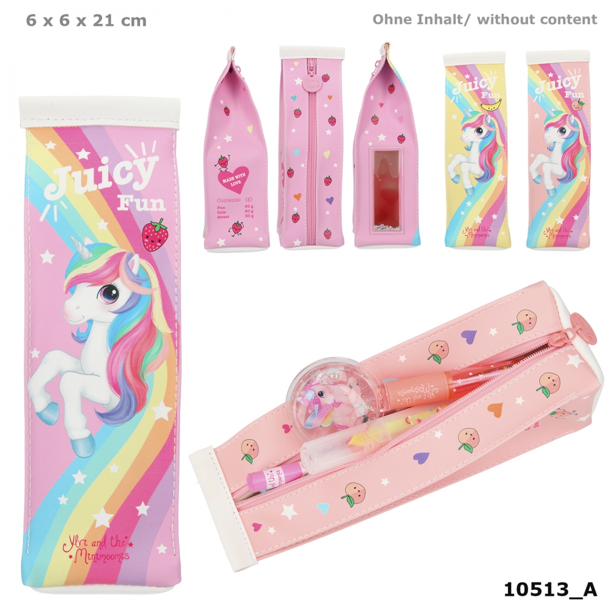 Piórnik soczek Jednorożec Ylvi, piórnik z miękkiego materiału w kształcie kartonika do soczku z wizerunkiem Jednorożca, trzy kolory do wyboru: różowy z truskawką, żółty z bananem i pomarańczowy z brzoskwinią.