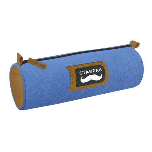 Piórnik w kształcie tuby jest zasuwany na trwały zamek. Wierzch piórnika jest pokryty kolorowym materiałem imitującym jeans. Boki i elementy dekoracyjne piórnika są wykonane z ekoskóry. Na piórniku znajduje się naszywka z modnym motywem wąsów. Piórnik jest wygodny i pojemny, a jednocześnie nie zajmuje dużo miejsca w plecaku.