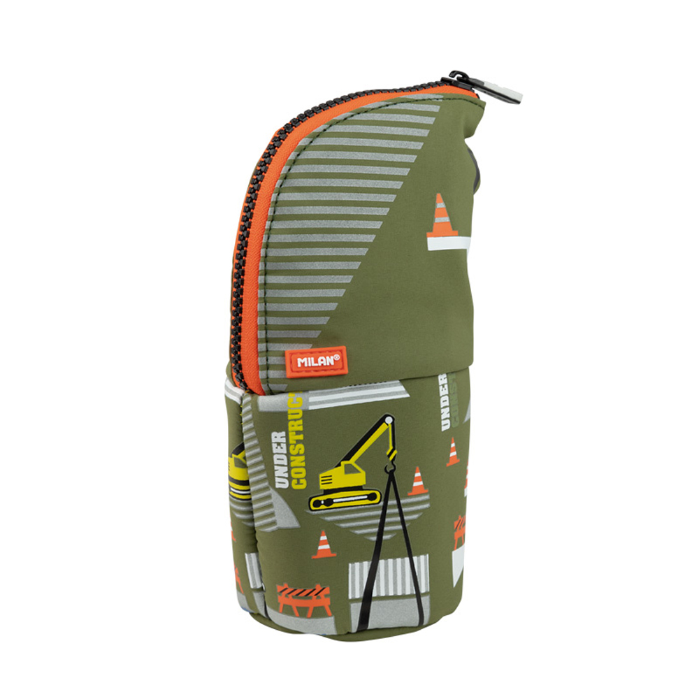 Stojący piórnik MILAN zapinanymi na suwak z kolekcji UNDER CONSTRUCTION w kolorze zielonym z wzorami maszyn budowlanych.
