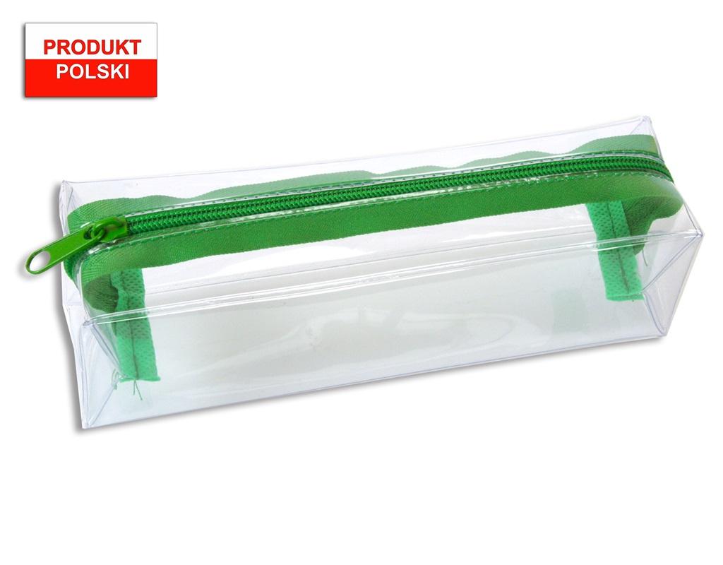 Piórnik klocek wykonany z folii wysoko przezroczystej. Piórnik o wymiarach 20 x 5 x 5 cm. Kolor przezroczysty z zielonym zamkiem. Piórnik bez wyposażenia.