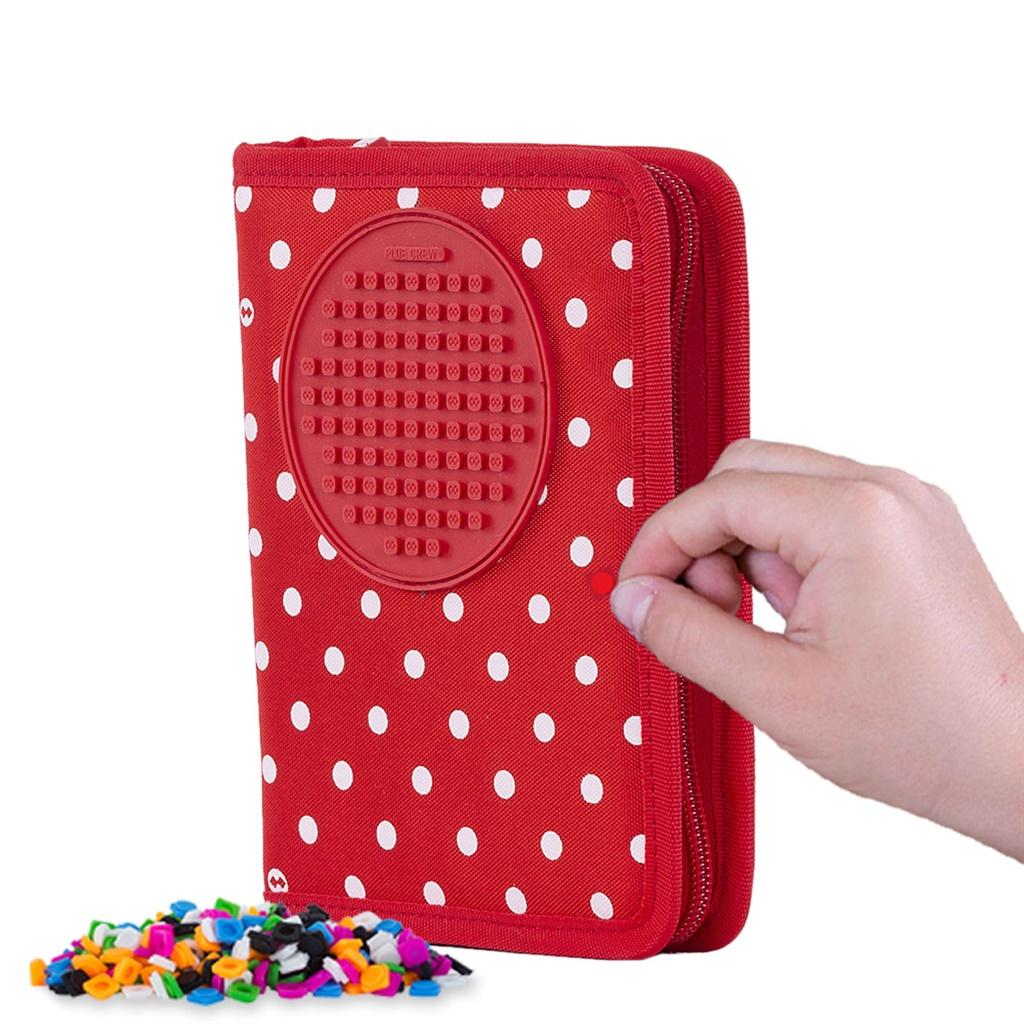 Szkolny piórnik na suwak PIXIE CREW z nadrukiem białych kropek, posiada kreatywny okrągły, czerwony panel, na którym można tworzyć oryginalne i spersonalizowane grafiki, za pomocą małych silikonowych pikseli. Piórnik wykonany został z poliestru. Wewnątrz znajduje się wystarczająco dużo miejsca na przybory szkolne. Jest 16 klasycznych gumek, do których można wsunąć ołówki, czy długopisy oraz 4 szersze na linijkę, gumkę, czy nożyczki. Wnętrze zawiera także transparentną kieszonkę. Piórnik jest sprzedawany z dodatkowym darmowym zestawem około 69 pikseli.
