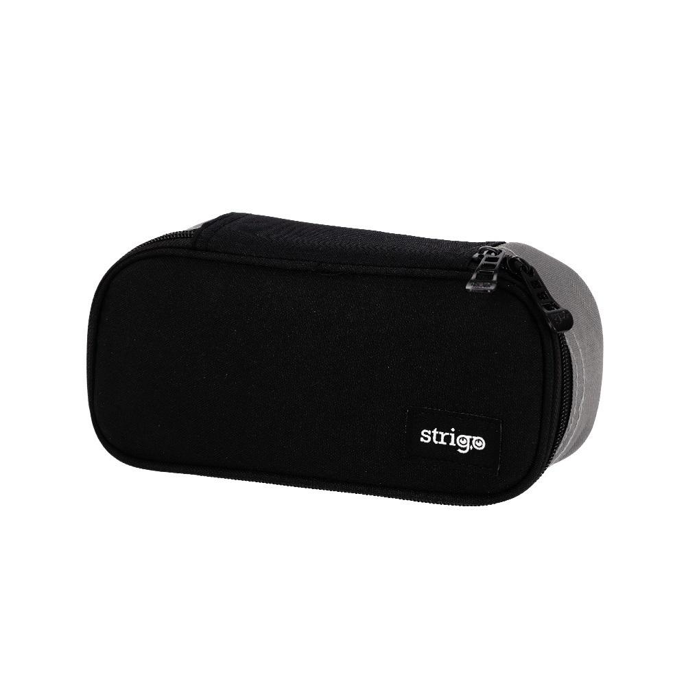 Piórnik szkolny Strigo z kolekcji Classic w kolorze czarnym z szarym paskiem. Wykonany z wysokiej jakości materiału, który jest odporny na zabrudzenia. Piórnik jest usztywniany i posiada dużą kieszeń wewnętrzną oraz klapka z miejscem na przybory piśmiennicze. Na górnej pokrywie znajduje się kieszonka. Piórnik posiada wysokiej jakości suwaki, które otwierane są zarówno z lewej jak i z prawej strony.