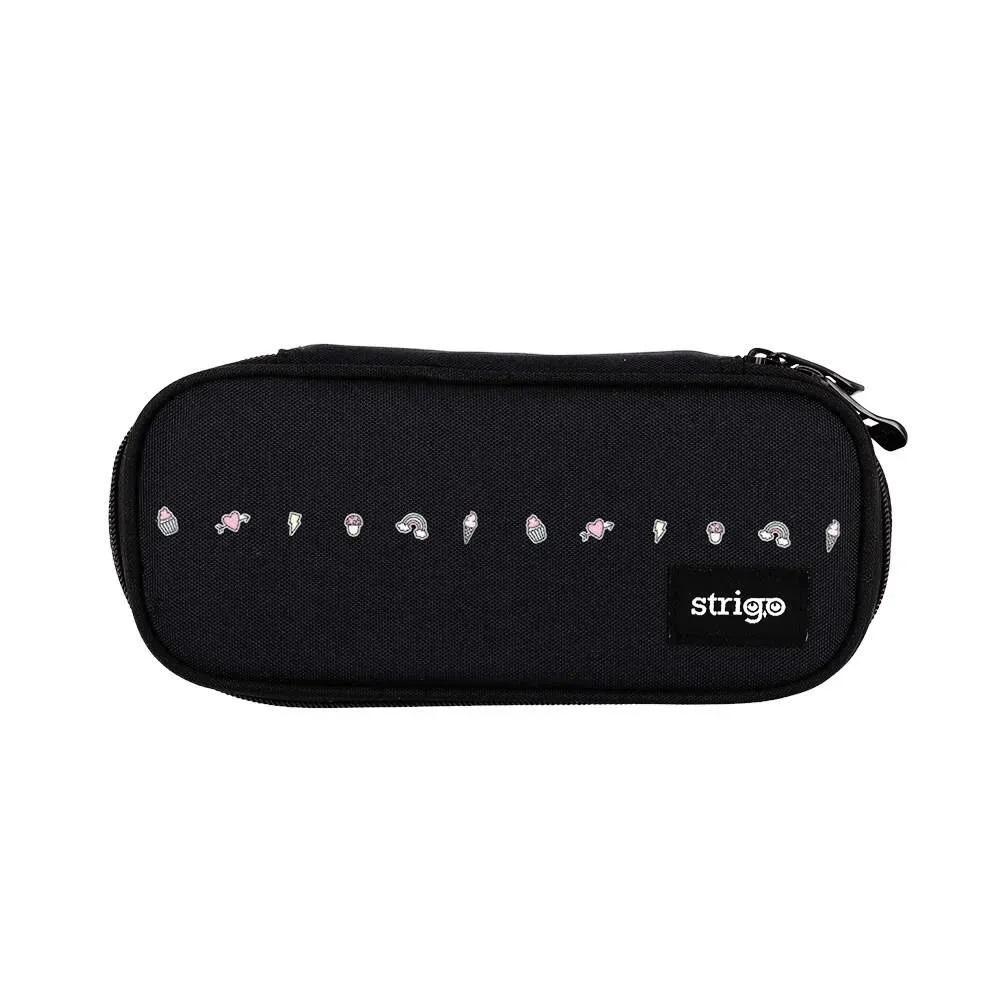 Piórnik szkolny Strigo z kolekcji Ikonki w kolorze czarnym. Wykonany z wysokiej jakości materiału, który jest odporny na zabrudzenia. Piórnik jest usztywniany i posiada dużą kieszeń wewnętrzną oraz klapka z miejscem na przybory piśmiennicze. Na górnej pokrywie znajduje się kieszonka. Piórnik posiada wysokiej jakości suwaki, które otwierane są zarówno z lewej jak i z prawej strony.