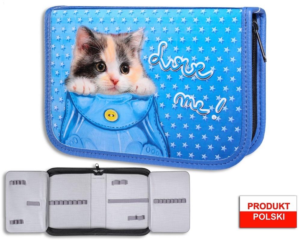 Piórnik twardy z 2 klapkami w środku wykonany z kodury, ozdobiony obrazkiem przedstawiającym kota. W środku piórnika znajdują się gumki umożliwiające trzymanie długopisów. Piórnik o wymiarach 20x14x5[cm]. Piórnik bez wyposażenia.