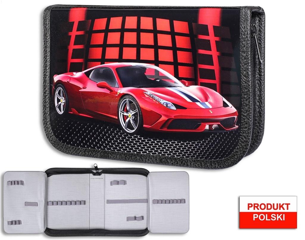 Piórnik twardy z 2 klapkami w środku wykonany z kodury, ozdobiony obrazkiem przedstawiającym samochód. W środku piórnika znajdują się gumki umożliwiające trzymanie długopisów. Piórnik o wymiarach 20x14x5[cm]. Piórnik bez wyposażenia.