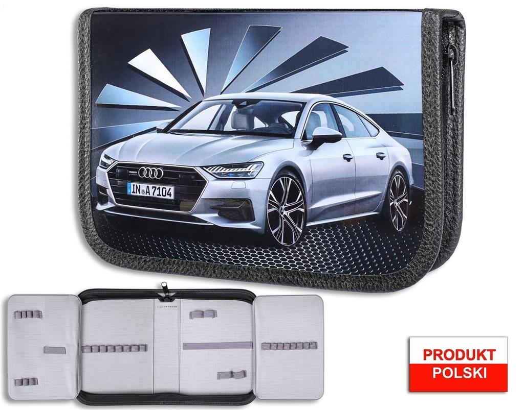 Piórnik twardy z 2 klapkami w środku, wykonany z kodury, ozdobiony obrazkiem przedstawiającym samochód. W środku piórnika znajdują się gumki umożliwiające trzymanie długopisów. Piórnik o wymiarach 20x14x5[cm]. Piórnik bez wyposażenia.