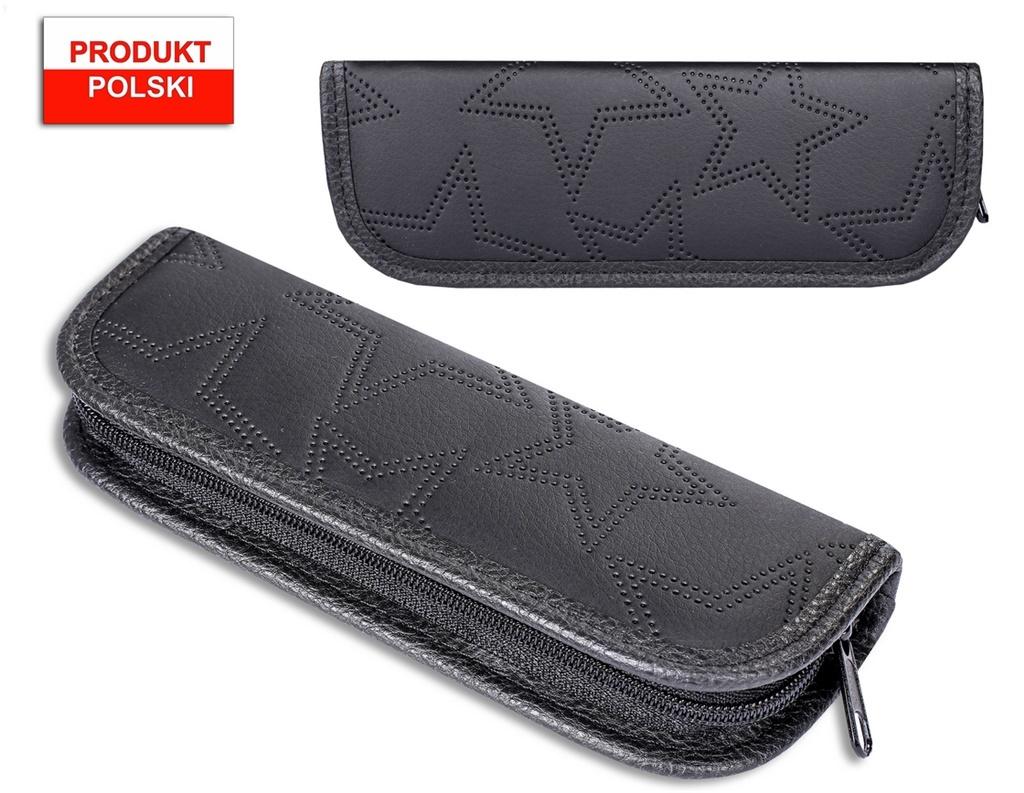 Piórnik na długopisy wykonany z tkaniny skóropodobnej, ozdobionej pikowaniem przestawiającym gwiazdki. Piórnik o wymiarach 20x4x2,8[cm]. W środku piórnika znajdują się gumki umożliwiające trzymanie długopisów. Piórnik bez wyposażenia.