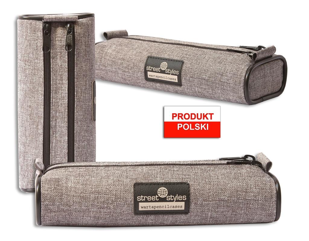 Piórnik płaski owal wykonany z szarej kodury ozdobiony naszywką street style. Wyrób posiada 2 zamki błyskawiczne, a co za tym idzie 2 niezależne komory. Piórnik o wymiarach 22x9x4[cm].