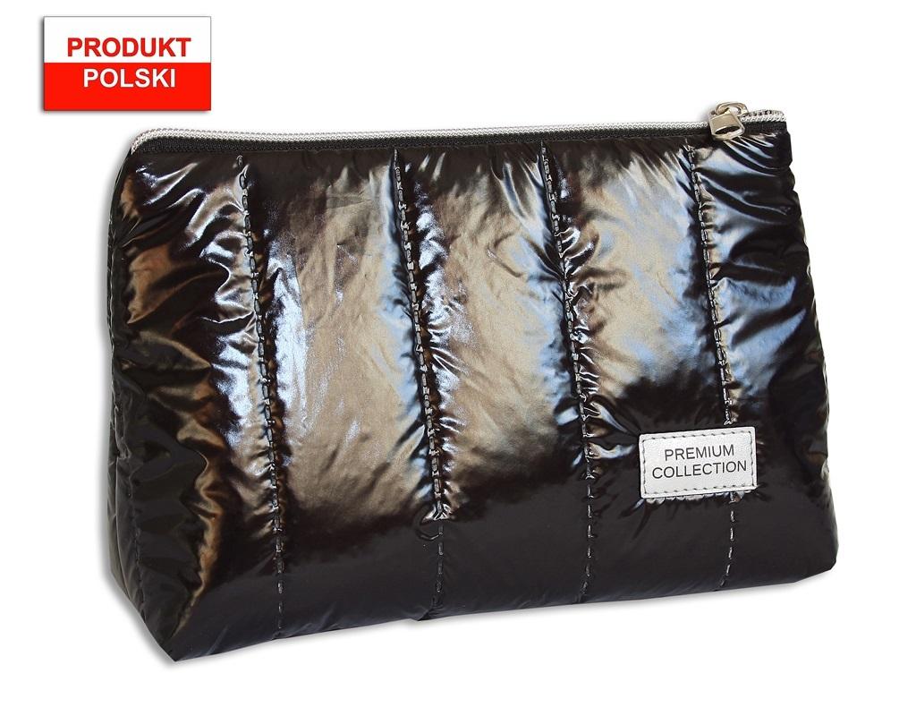 Piórnik kosmetyczka wykonany z tkaniny o wysokim połysku, ozdobionej naszywką. Piórnik o wymiarach 21x13x7[cm]. Kolor czarny. Piórnik bez wyposażenia.