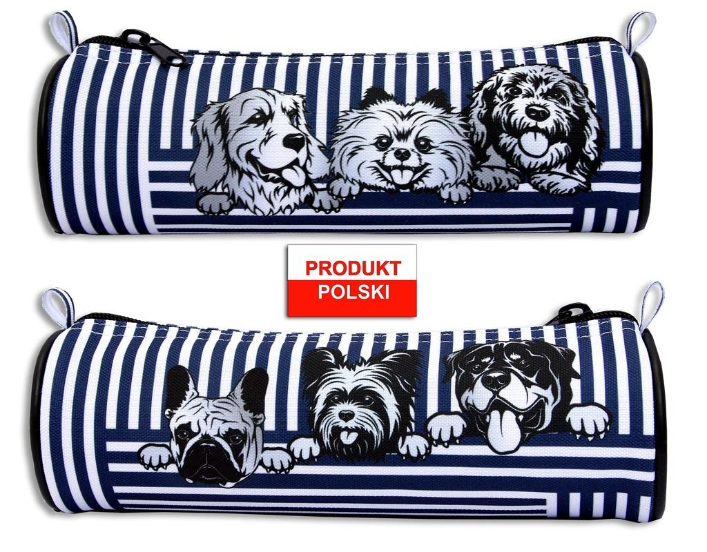 Piórnik tuba wykonany z kodury, ozdobionej nadrukiem przedstawiającym psy wykonanym w technologii sublimacji. Piórnik o wymiarach 21x7[cm